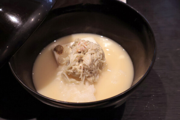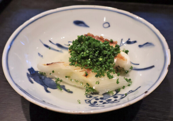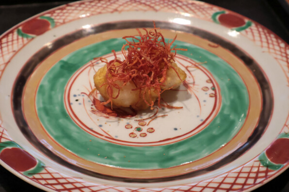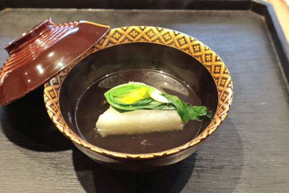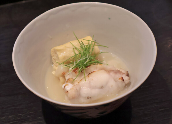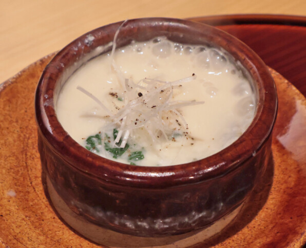 ●とらふぐと巻き湯葉、芽ねぎ。百合根のすり流し。
