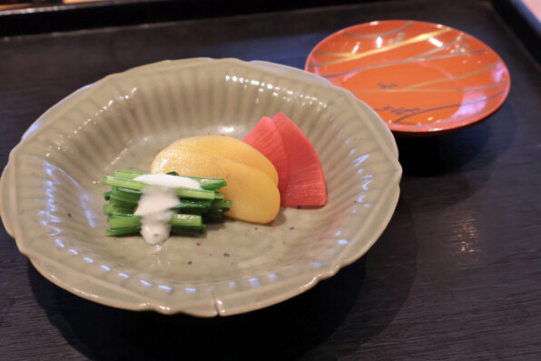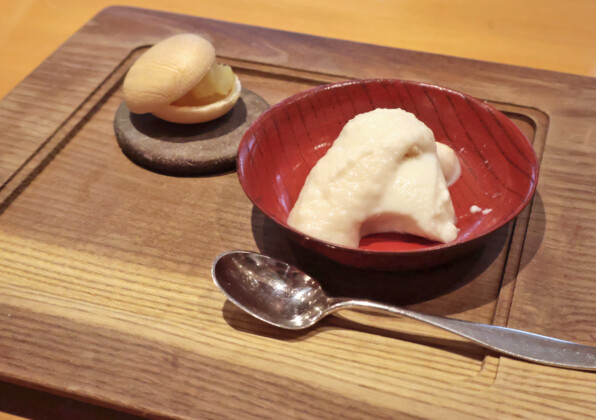 ●酢漬けの赤かぶと共に、求肥昆布で包んだ牛肉。低温でじっくり火を入れた牛肉は、優美な口当たりでした。