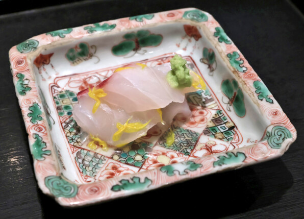 ●お造りは、めいち鯛。紅芯大根、オリーヴ醤油あん、わさび。