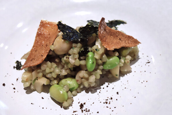 お精進かと一瞬思うのだけど、中に白味噌に包まれた牛肉入り。さらに松の実、ほおずきトマトなどで、食感も豊か。
