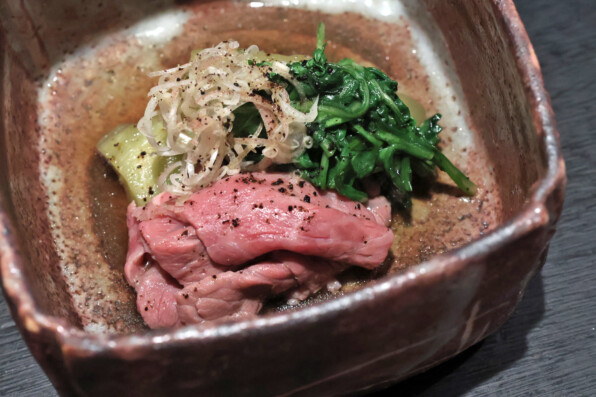 水茄子、自家製金山寺味噌甘海老和え、黒七味。