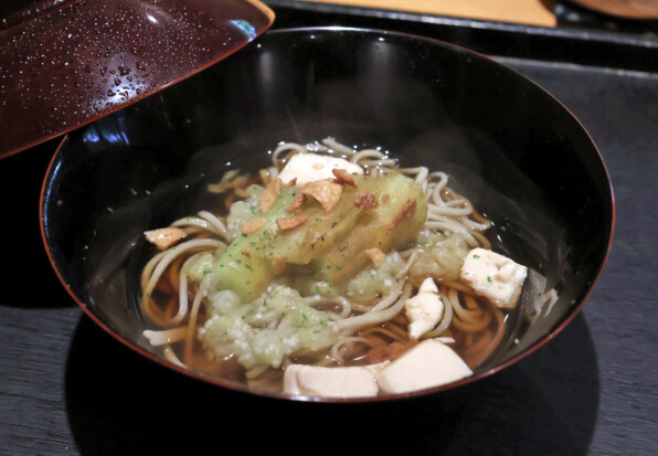 お蕎麦それじたいがかぼちゃ風味をまとって旨、さらに上の甘海老金山寺味噌からも、下のおだしからも複合的な旨味が加わって、めくるめく美味の世界が開けていました。