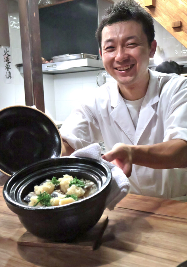 鱧に油をかけて、炭を当てて香ばしくしています。