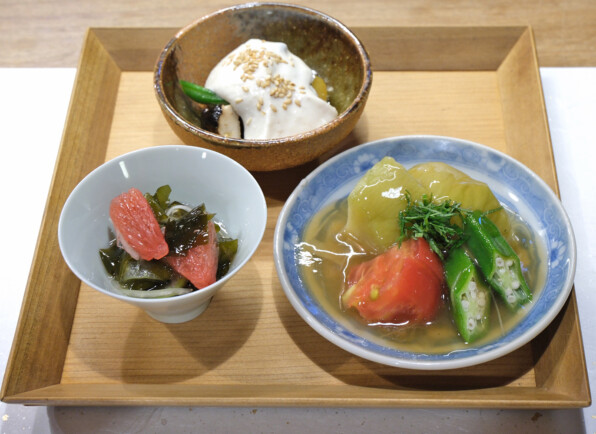 ・焚き合わせ(冷製)賀茂茄子、おくら、トマト。生姜のあん。大葉。