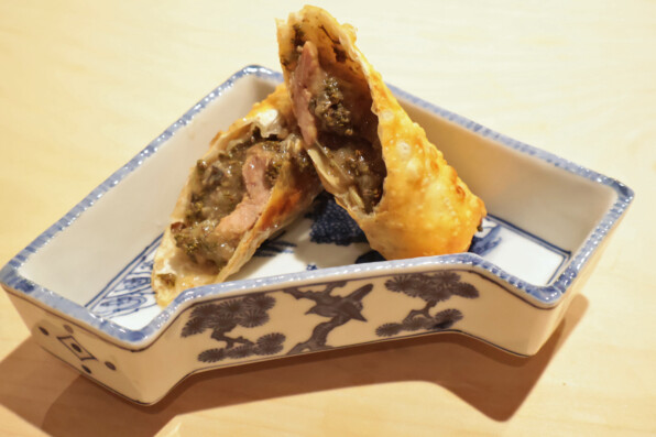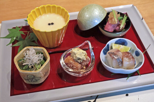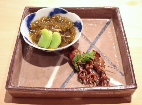 ・(八ツ橋の上、左から、)あいなめの南蛮漬け、ミニサイズ丸十(さつまいも)の炊いたの、そら豆、川海老、揚げた新じゃが。上に結び昆布。