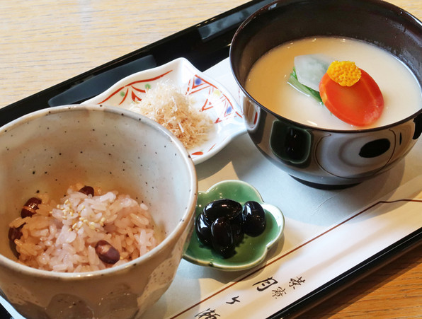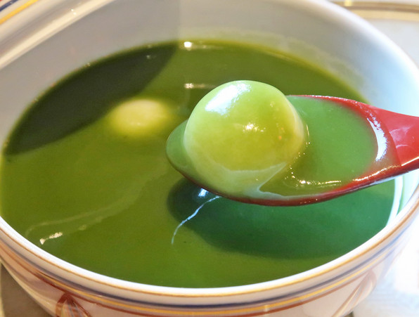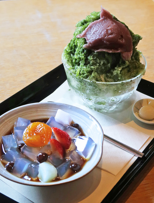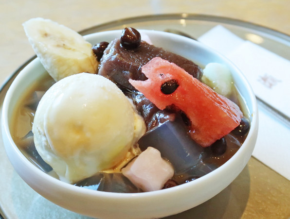 ふるふるの寒天に粒粒した赤豆、やわやわの白玉と求肥。黒蜜がひたひたにたっぷりと。