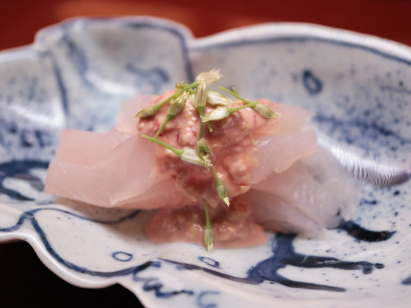 ●先附 鱧落とし 糸瓜 ズッキーニ 長芋 梅肉正油 わさび 花穂