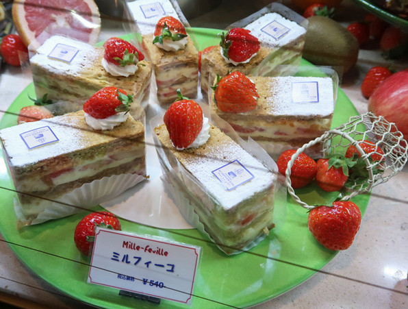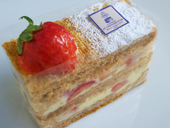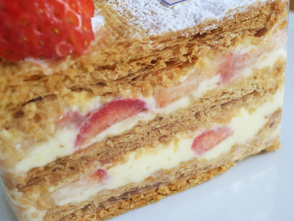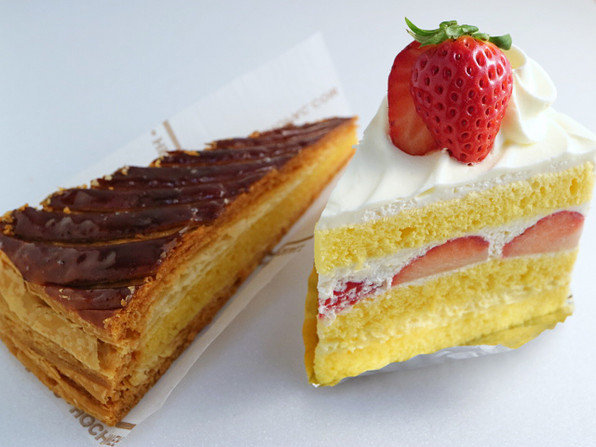 ■ こちらは少し前に初めて買ってみた、ビスキュイショートというもの。2度焼きしたという、しっかり硬めの生地を使ったいちごのショートケーキです。ぐるりと生クリームで囲んであります。いわゆるショートケーキと思って食べたら全然違う食感です。新しい感覚で好きと言う人と、従来の方がいいという人と、はっきり分かれると思います。
