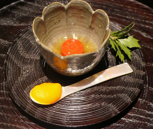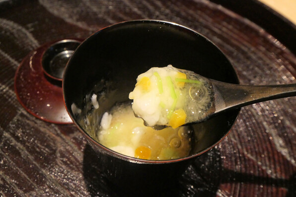 ●先付1 すっぽん豆腐 胡麻豆腐にすっぽん入り。すっぽんだしのあん。九条ねぎ、生姜。