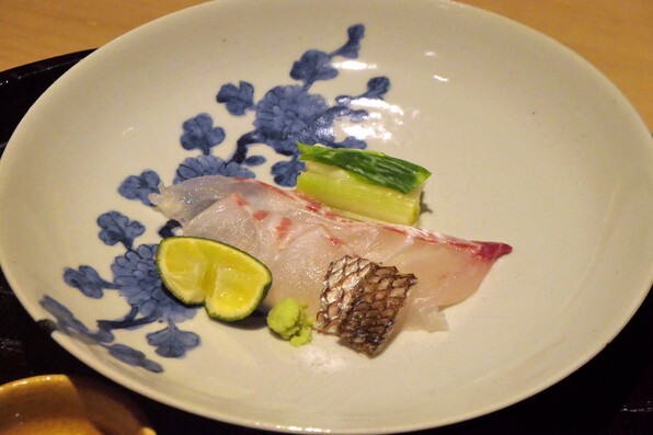 ●お造り2 水口商店さんの鯛。紅白のよりにした人参と大根。醤油と肝醤油。