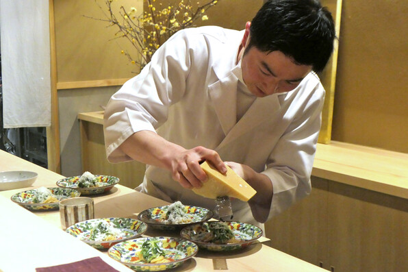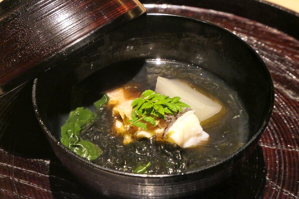 ●お椀は肉厚のちぢみほうれん草に甘鯛、氷蕪(雪に見立てて砕いた蕪)、あられ柚子。