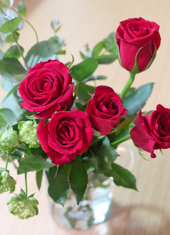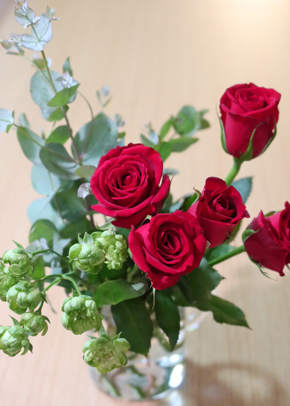 ●珍しくピンクのバラ。お世話になっている方のお嬢さんの誕生日に用意したもので、お花は八百一本館の2階の「Harmonius」(アルモニウス、とフランス語読みではない、ハーモニアス)さんです。ピンクのバラとはいえまわりはうっすら黄緑で、まわりのスプレーバラやカーネーションと色が合っていると思います。わたしも同じ日の帰り道に、赤バラに、まわりは同じ組み合わせで購入したのでした。