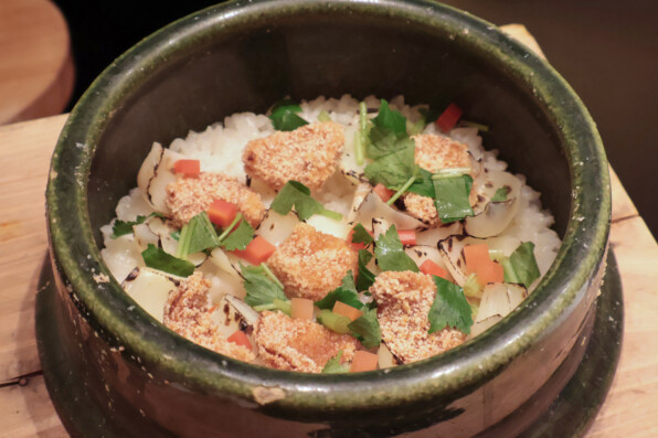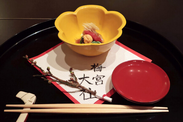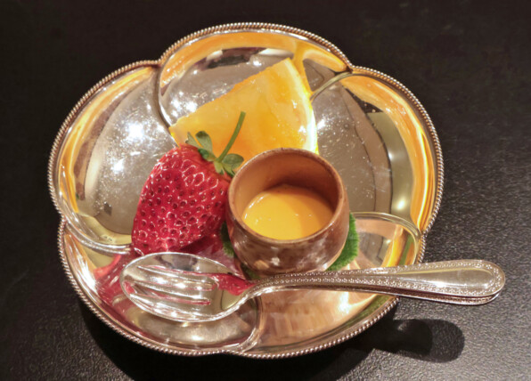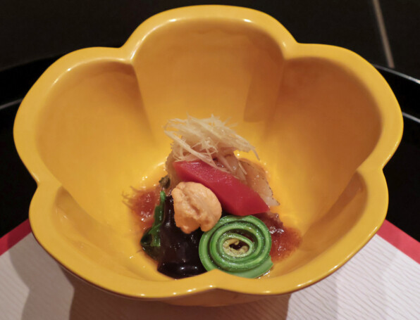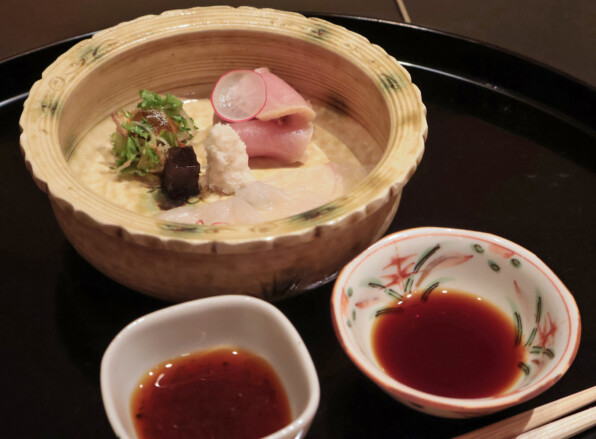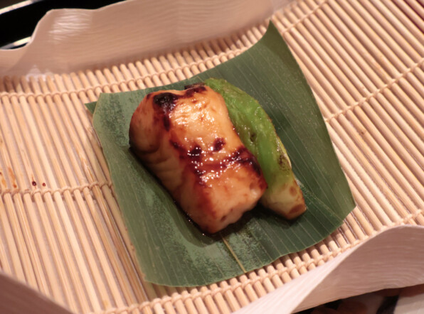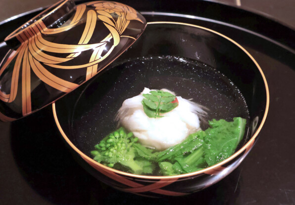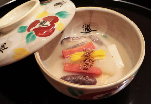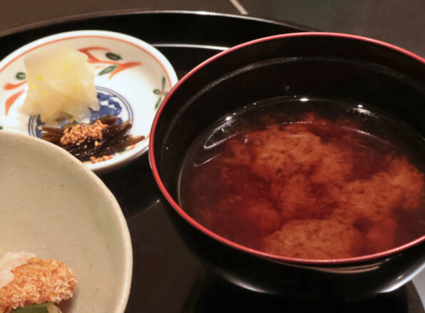 赤だしの中に小芋、これがピュレ状にされたのを丸めてあって口当たりソフトで素敵でした。おいしかった😭