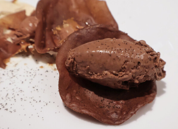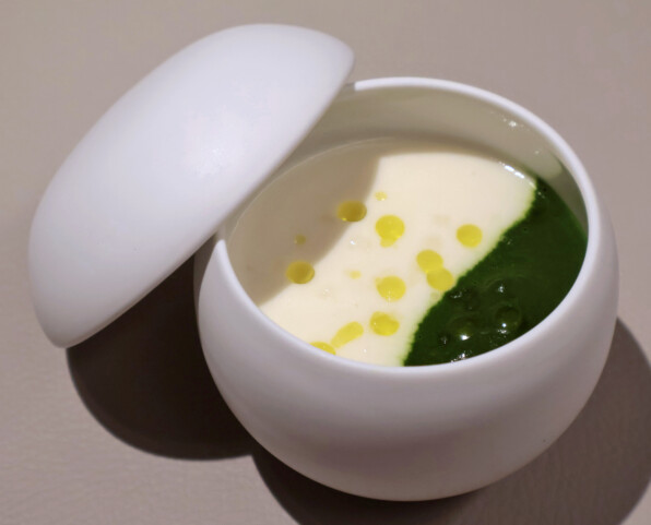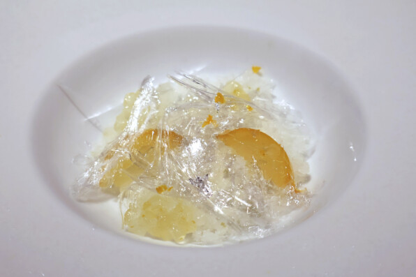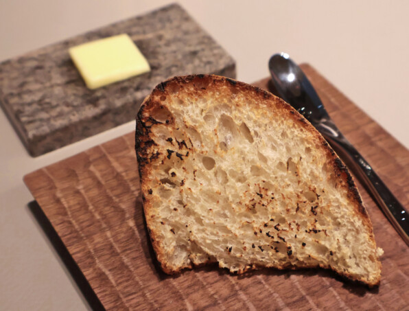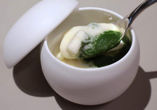 すずきを、あおさ海苔入りの衣で包んだベニエ。かりかりと外側の歯応えよく、あおさが香り立ち、すずきはふんわりと。