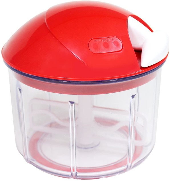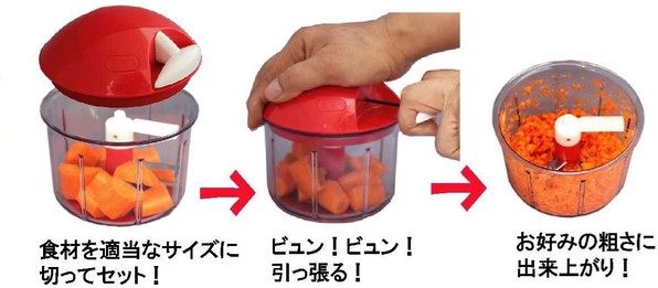 ●こんな感じです。ざくっと切ってからチョッパーに投入、10回も引っ張ればみじん切りになるのです。