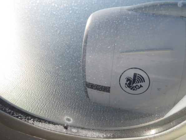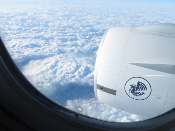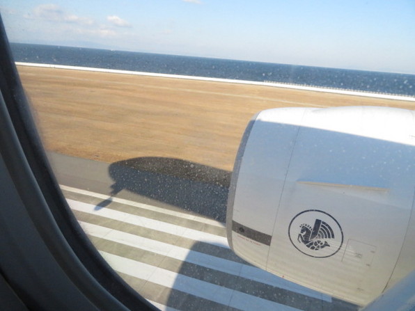 雲の上、海の上、着陸の瞬間、駐機場に入って停止したところ。全部撮っておきます。時間の記録に。