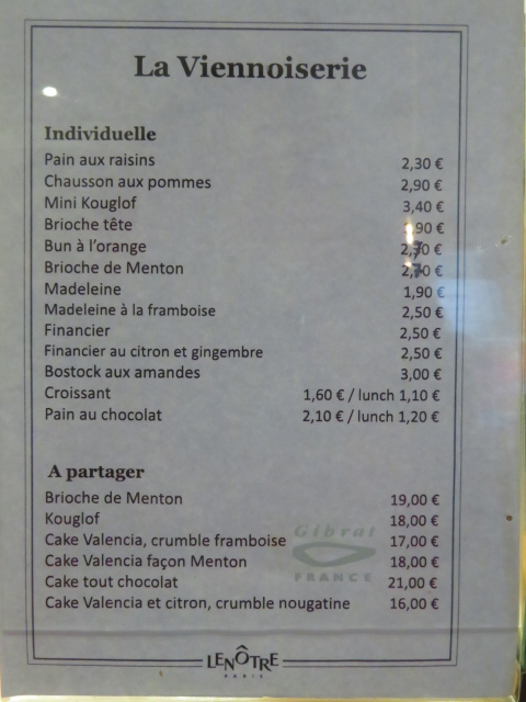 パンオショコラ 2.1ユーロ、カプチーノ 5.5ユーロ。