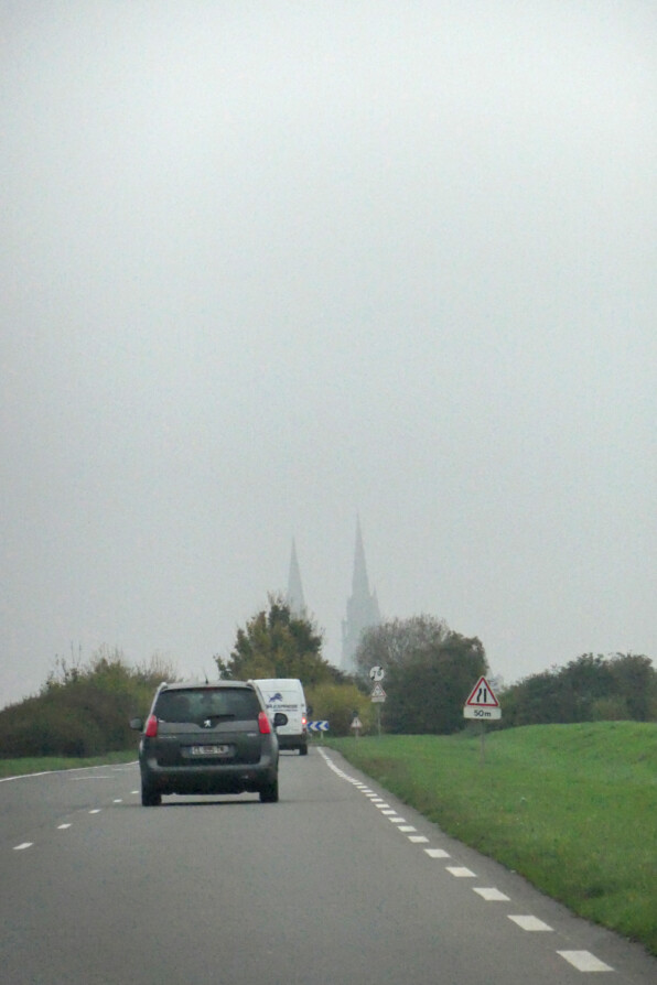 シャルトルの、高さが違う2つの尖塔が霧の向こうに見えてきたところ。